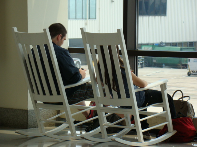 bene di questo passo al prossimo viaggio troviamo anche una bella ecografia così ci guardano pure dentro, superato l’esame analitico camminiamo un po’ a curiosare lungo le vetrate dell’aeroporto, si trovano queste sedie a dondolo e subito c’è chi ne approfitta