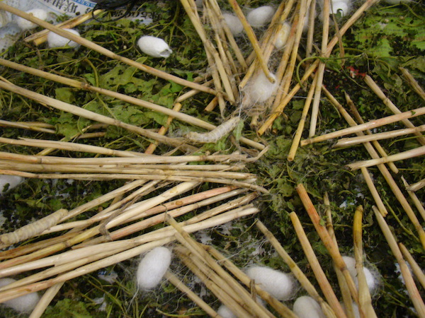 oppure bozzoli stesi su un telaio ad asciugare che rimarranno grezzi