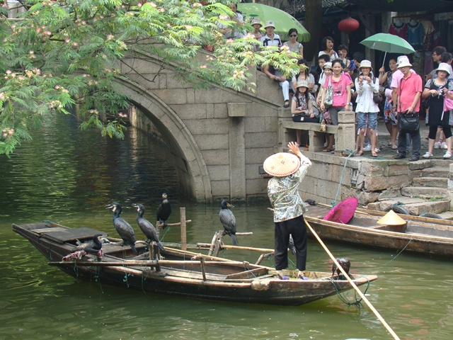 poco più avanti un cinese si guadagna qualche yuan facendo fare le foto al gruppo di turisti cinesi mostrando la tecnica della pesca col cormorano, il pesce usato penso fosse sempre lo stesso