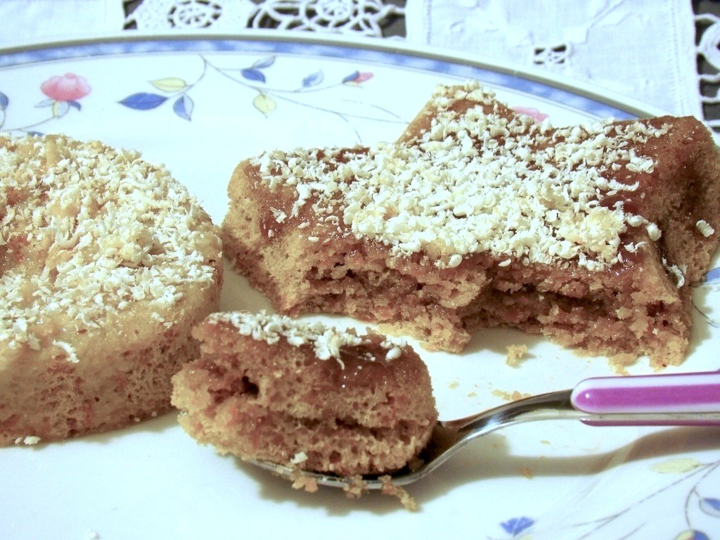 Comunque queste tortine cotte in tre minuti sono perfette, leggere, morbidissime e ben lievitate, io le ho farcite ricoprendone una con del semplice cioccolato bianco fuso e l’altra con della gelatina d’uva fragola spolverizzandole poi una volta freddate, tutte e due con il cioccolato bianco grattugiato.