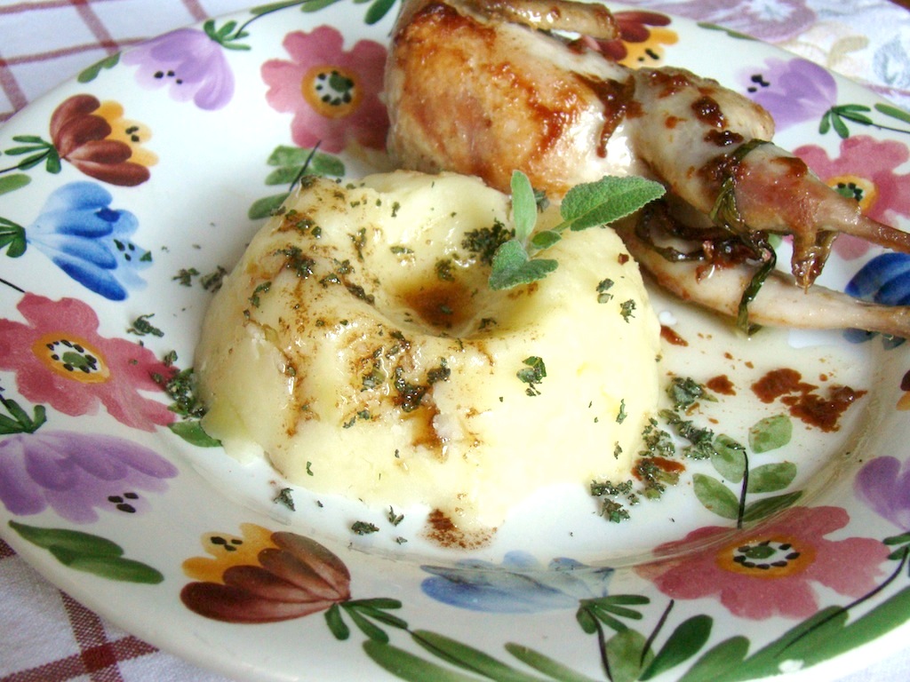 Cuocere le patate, pelatele e schiacciatele, salate e aggiungete qualche cucchiaio di latte ben caldo tanto da formare un purè della densità desiderata, unite parte della salvia tritata, formate un piccolo “vulcano” schiacciando con il pollice al centro e sistemate nel cratere ottenuto il burro nocciola, spolverate con altra salvia, avvicinate una quaglia irrorata del proprio fondo di cottura e datevi da fare……è consentito e consigliato l’uso delle mani ^_____^