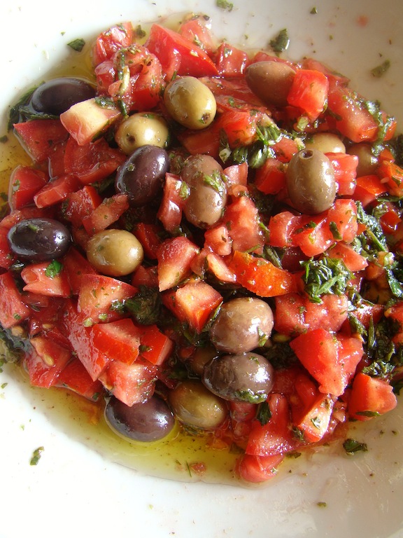 Ingredienti per 3 : 240 gr. di pasta corta, tre cucchiai di maionese, 2 cucchiai scarsi di succo di lime o limone, un grosso pomodoro maturo, due cucchiai di basilico e menta con un pezzetto di aglio tritati, due cucchiai di olive taggiasche in salamoia, sale e buon olio.