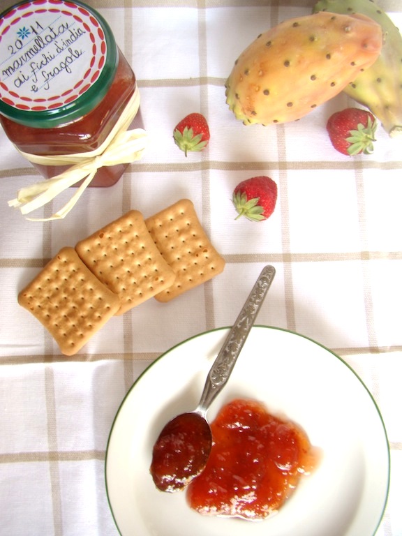 Ingredienti per 1 vasetto da 250 gr. e 1 da 125 gr. : 7 fichi d’india, 250 gr. di fragole, 300 + 50 gr. di zucchero, succo di 1 limone.