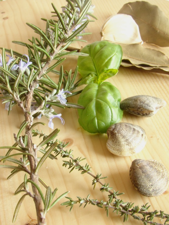 Ingredienti per 4 : 1kg. e 1/2 di arselle o vongole lupini, 1 rametto di rosmarino, 1 rametto di timo, 2 foglie di alloro secco, qualche fogliolina di basilico, un cipollotto o uno scalogno, 4 cucchiai di olio evo, 1 bicchiere di vino bianco, 1 spicchio di aglio, 20 gr. di burro, 2 cucchiai di farina, fette di pane toscano spennellato di olio e tostato, prezzemolo tritato per ultimare (che io ho dimenticato).