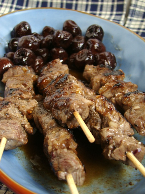 Tre anni fa provai a fare le ciliegie sottaceto e dato che mi erano piaciute l’anno scorso ne ripreparai altri 2 vasetti……. l’attesa minima  prima di usarle è di 2 mesi quindi le ho riposte nella dispensa e sono finite dietro alle marmellate…..ora che i vasetti di marmellate in prima fila praticamente sono finite………loro sono ricomparse!! ed è sicuramente arrivato il loro turno, visto che ormai si affacciano le nuove ciliegie. Le ho abbinate a degli spiedini di costata marinati e cotti velocemente………..ma con i frutti freschi potete fare anche un filetto con ciliegie al porto.