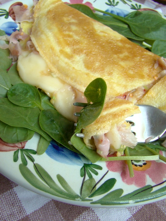 Scaldato una padella antiaderente ho sciolto una noce di burro o olio, ho versato le uova sbattute e una volta che l’omelette si è cominciata a rapprendere ma la superficie rimane ancora cremosa ho aggiunto solo da un lato, le fette di formaggio seguite dal prosciutto tagliato a pezzetti e la parte verde del cipollotto.