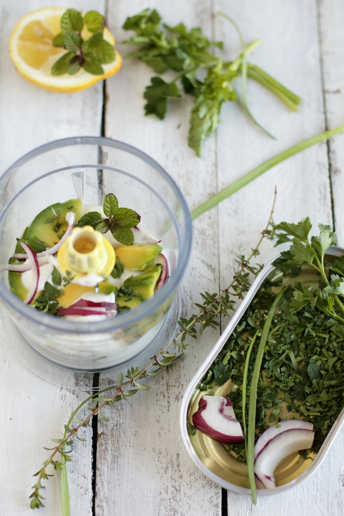 L’avocado e lo yogurt danno una cremositá che avvolge le verdure e le rende corpose, inoltre il condimento é ricco di fermenti lattici, grassi buoni e vitamine, quindi molto salutare.